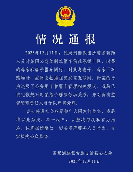 12月11日,我局河西派出所警务辅助人员时某因公驾驶制式警车前往承德市区,时某的母亲和妻子搭车同行。时某与妻子、母亲下车购物时,被网友拍摄视频发至互联网。时某的行为违反了公务用车和警车管理相关规定,我局已依纪依规对时某给予解除劳动关系,并对负有监督管理责任人员予以严肃处理。